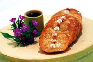 明清時期,寶應白蓮藕粉被列為皇室貢品,有“鵝毛雪片”之稱;寶應藕菜“蜜餞捶藕”滿譽江淮,為四方賓客所稱道。當時寶應名士喜好 藕菜,產生了“全藕席”,室供碗蓮盆景,壁掛荷花詩 畫,席中放一花瓶,以清水插鮮荷花數朵,色香味具全, 頗具雅趣。當今揚州的“全藕宴”列為寶應十大名菜之首,給您帶來清淡、涼爽、馨香的感受。