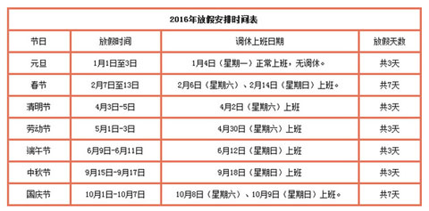 2016年元旦、春節、清明節、勞動節、端午節、中秋節和國慶節放假調休日期的具體安排通知如下。